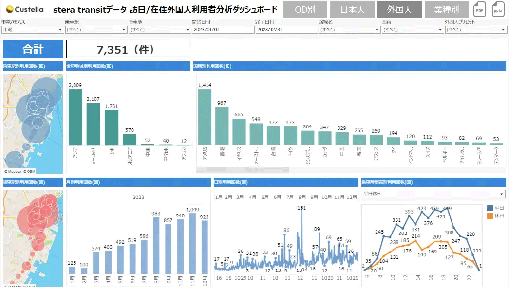 登坂(三井住友カード):二つ目は「乗降データ×日本人データ」の画面で、どのような年代・家族構成・年収の人が、いつ、どれくらい乗降しているかが確認できます。三つ目は「乗降データ×外国人データ」で、どの国で発行したカードを持っている人が、いつ、どれくらい乗降しているかがわかる画面です。