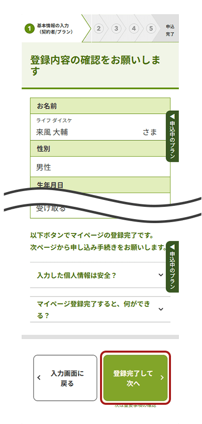 間違いなければ、「登録完了して次へ」ボタンを押下します。ここでマイページ登録が完了となります。