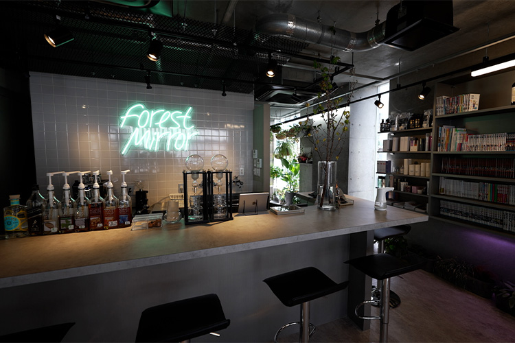 美容室ではカラーやパーマの薬剤を使います。科学的な部分が多いことから、研究所をイメージしたコンクリートの内装と、店内に置いた植物で「無機質と有機質のコントラスト」を演出しました。今までにない不思議な雰囲気で、クリエイティブな空間をつくることができたと思います。テーマパークをつくるような気持ちで、お客様に楽しんでいただくことを目指しているので、美容室にはカフェも併設し、待ち時間もくつろげる空間づくりを目指しました。また、幅広いジャンルの漫画やゲーム機を置いたり、高級ホテルでしか取り扱っていないお茶をご提供したり、発売されたばかりの新しいカラー剤を取り入れたりもしています。店に置くものは、一つひとつこだわりを持ち、お客様にいかに楽しんでいただくかを常に考えています。