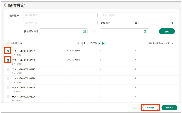 配信を停止したい端末のチェックボックスをクリックし、[配信解除] ボタンをクリックする。