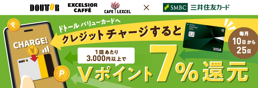 毎月10日~25日の間、対象のクレジットカードでドトール バリューカードに1回あたり3,000円以上チャージしていただくと、通常のポイントに加え、+6.5%のVポイントが還元されます。(合計7%還元)