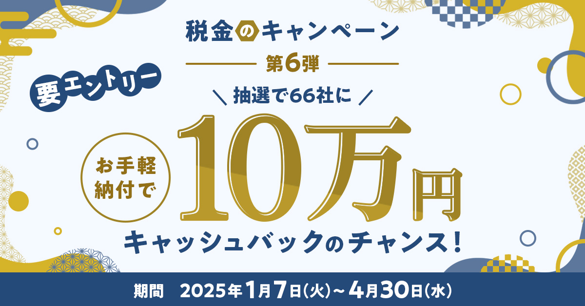 期間中に対象カードにて国税を1回5,000円以上納付すると、抽選で66社に10万円が当たる!