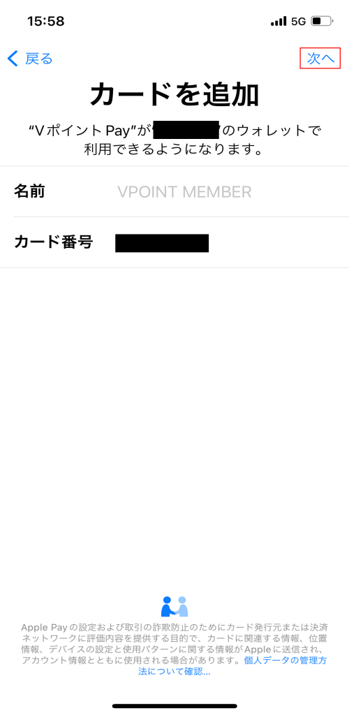 表示されたクレジットカードの情報を確認のうえ次へをタップ
