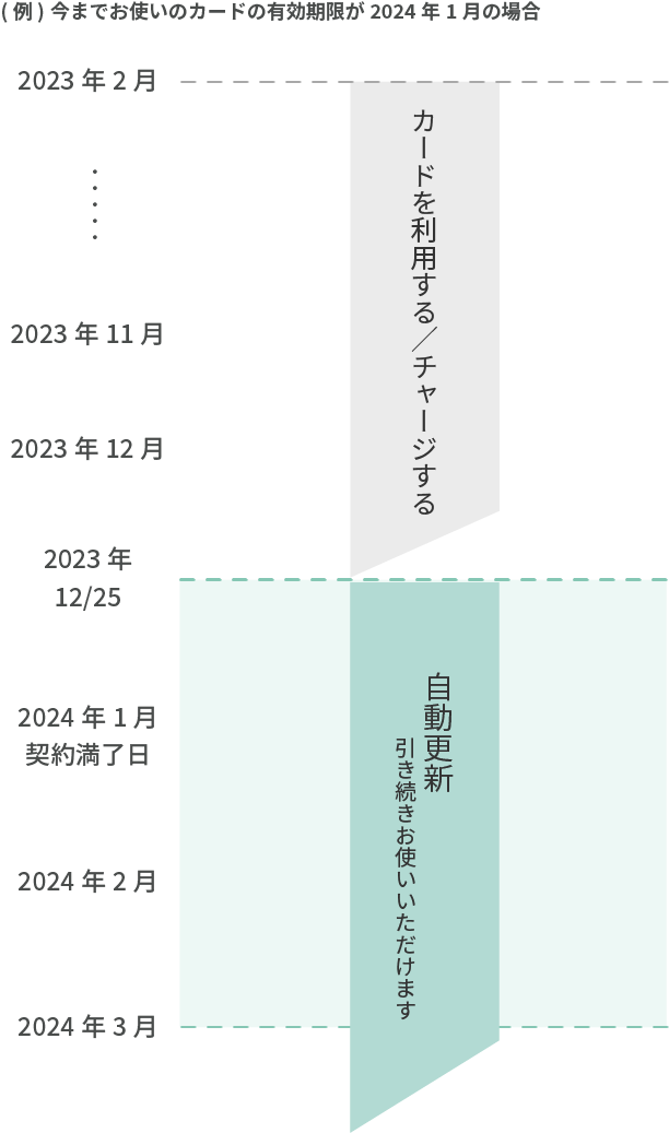 有効期限の1年前~前月の25日までの間に、ご利用もしくはチャージをしている場合は、有効期限が自動で更新されます。