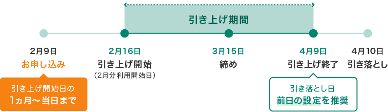 - ご利用予定日よりもお申し込みのタイミングが早すぎると、支払日が引き上げ期間の最長日(3ヵ月後)よりも前となり、お買い物の支払い日前日を引き上げ期間(引き上げ終了日)として入力できなくなります。