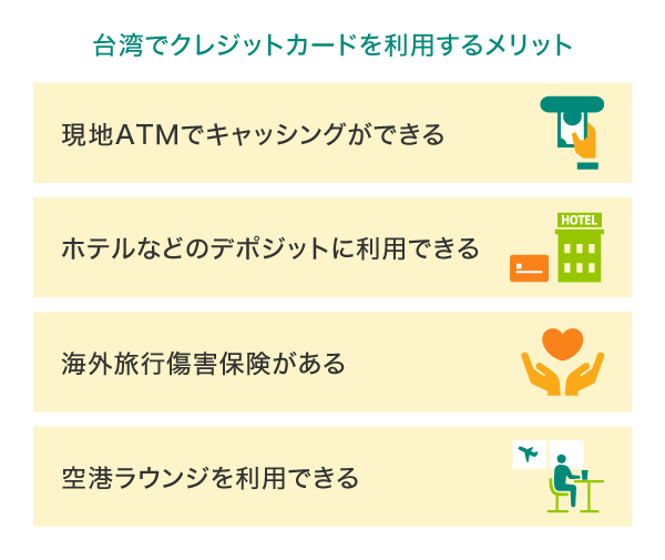 台湾旅行にクレジットカードを持っていくことには、現地のATMで台湾元を引き出すキャッシングサービスを利用できるメリットがあります。また、ホテルのデポジットの支払いができることや、海外旅行傷害保険が付帯されているなどのメリットも挙げられます。