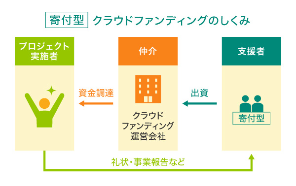 プロジェクトの実施者が、自分のやってみたい夢や活動をプロジェクトとして企画し、インターネット上で情報を発信して、それに共感した支援者から必要な資金を集めるしくみです。従来の金融機関からの融資やローン、国の助成金とは異なり、新しい資金調達の方法として注目されています。