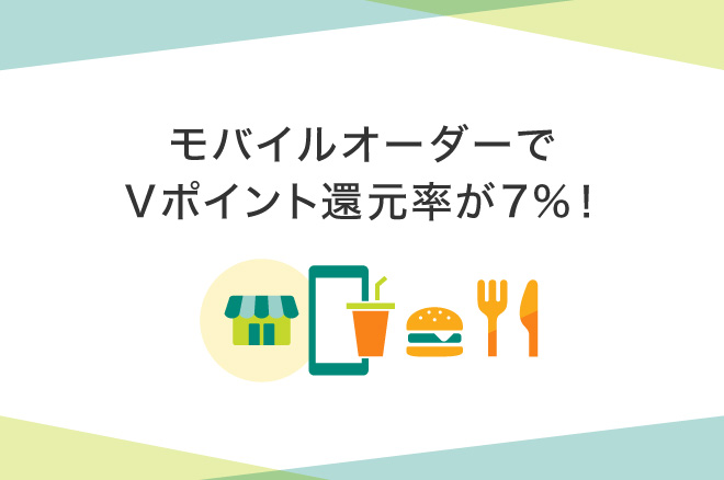 対象の三井住友カードで、対象店舗でモバイルオーダーを利用すると、Vポイントの還元率が7%にアップします。ぜひ、三井住友カードでお得なモバイルオーダーを活用してみてください。