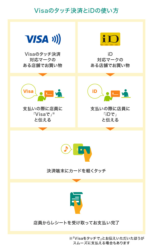 非接触型の決済サービスであるVisaのタッチ決済とiD。どちらも専用端末にかざすだけで決済ができるもので、カード型とスマートフォンへ登録するタイプの2種類があります。