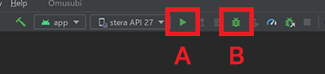 仮想環境の構築が完了すると、画面上部の実行マーク(A)とデバッグマーク(B)がクリックできるようになります。