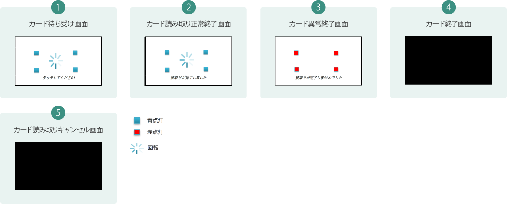 | 1 | カード待ち受け | 待ち受け画面表示 タッチしてください LED 青点灯 |