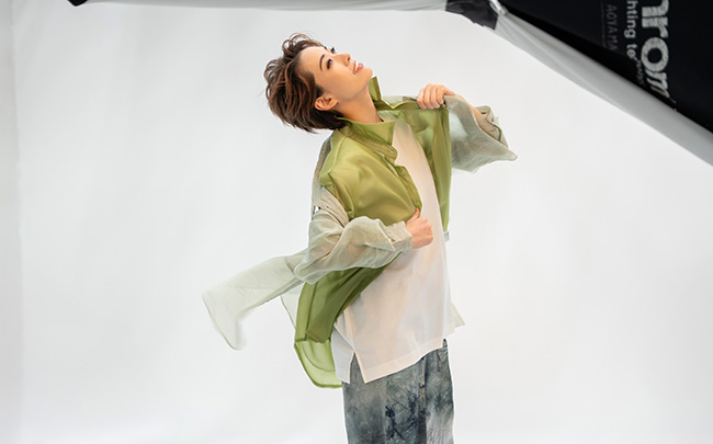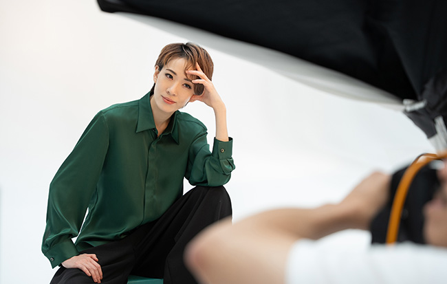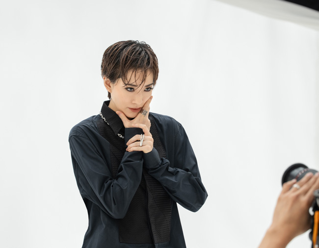 緑色のシャツが春の風になびくイメージで撮影したカットでは爽やかに、白くふわふわの毛が印象的な上着を着たカットではゴージャスに。衣装が変わるたびにまったく違った雰囲気をまとう表現力が見事。終盤は、モード系のヘアメイクにチェンジしてセクシーに。手でポーズを変えていく様子に、キー氏も「指輪の広告みたい!」。見たことのない表情が次々と引き出されていきます。
