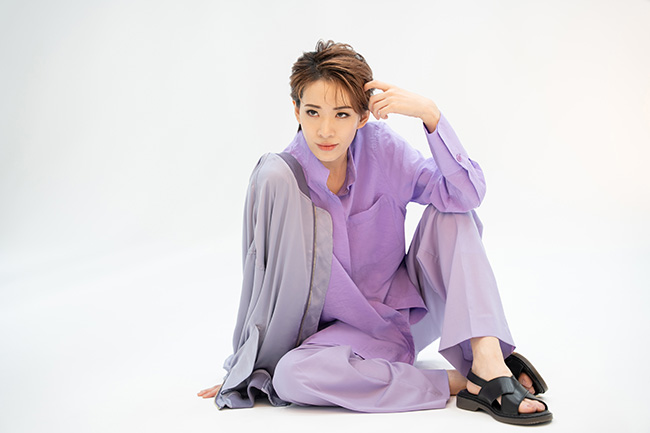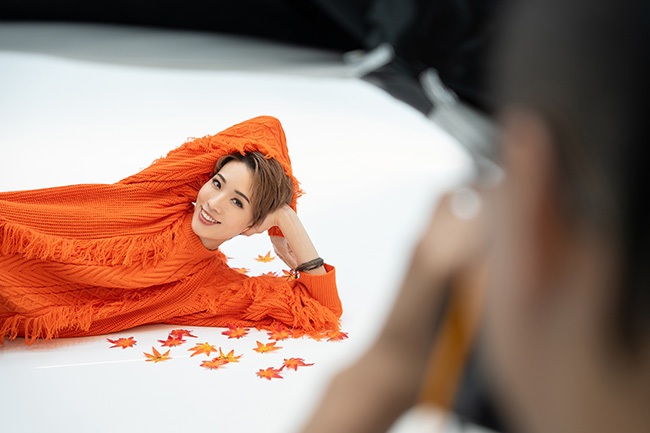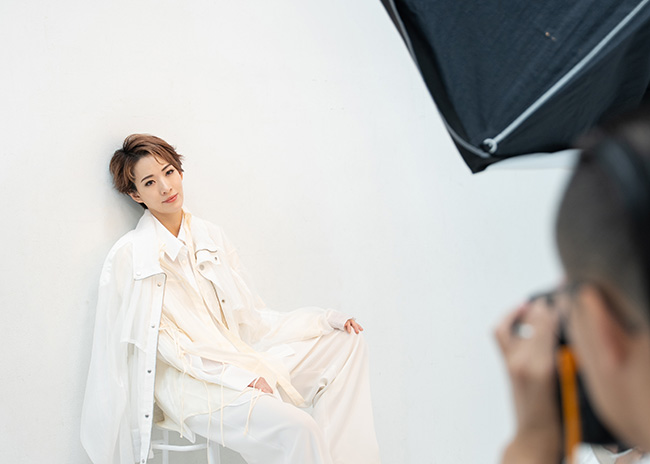 紫色のシャツにジャンパーをさらりとはおった姿は、自然体でありながらクール。キー氏もモニターを見ながら、「表情、いいね。書道家みたい!」と太鼓判。続くスツールに座って壁にもたれて撮影するカットでは、涼しい秋風のなかでまどろんでいる様子を表現していきます。