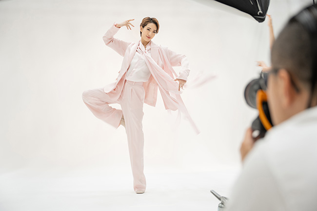淡いピンクのスーツは、風を起こしながら全員で息を合わせて撮影。躍動的なポーズも次々と決まり、キー氏も「Beautiful!」「Nice!」と感嘆。体を大きく動かしながら、手の表情も付けていくという難しいリクエストに応える様子は、高いダンス力と均整の取れたスタイルを持つ永久輝ならでは。なびくスカーフがバッチリ決まった写真を見て、本人も「すごい!」とつぶやく仕上がりとなりました。