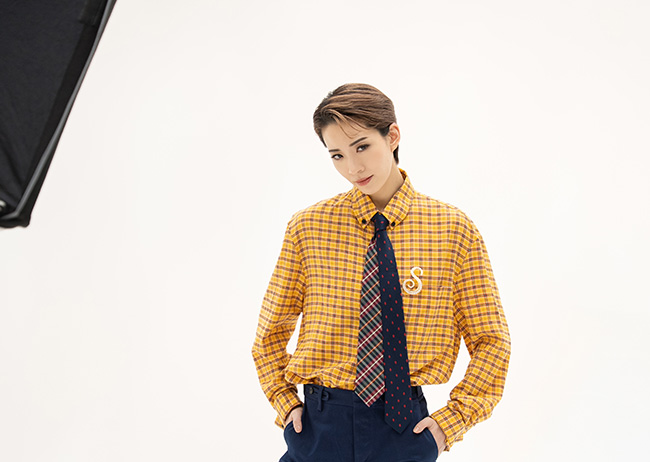 チェックのシャツを着たカットは、アンニュイな表情から強い視線、笑顔と表情豊かで、現代ミュージカルの一場面のよう。水色のシャツやジャケットを重ね着したカットなどストリート感のある衣装では、全身を使って元気なイメージを表現していきます。