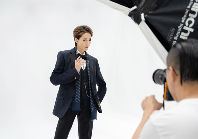 撮影もいよいよラスト。男役らしい濃紺のスーツをバリッと着こなし、最後のカットに臨みます。疲れも見せずに抜群にかっこよく決めていく姿に、スタッフからも歓声が上がります。キー氏の「OK!」の言葉とともに、終了となりました。
